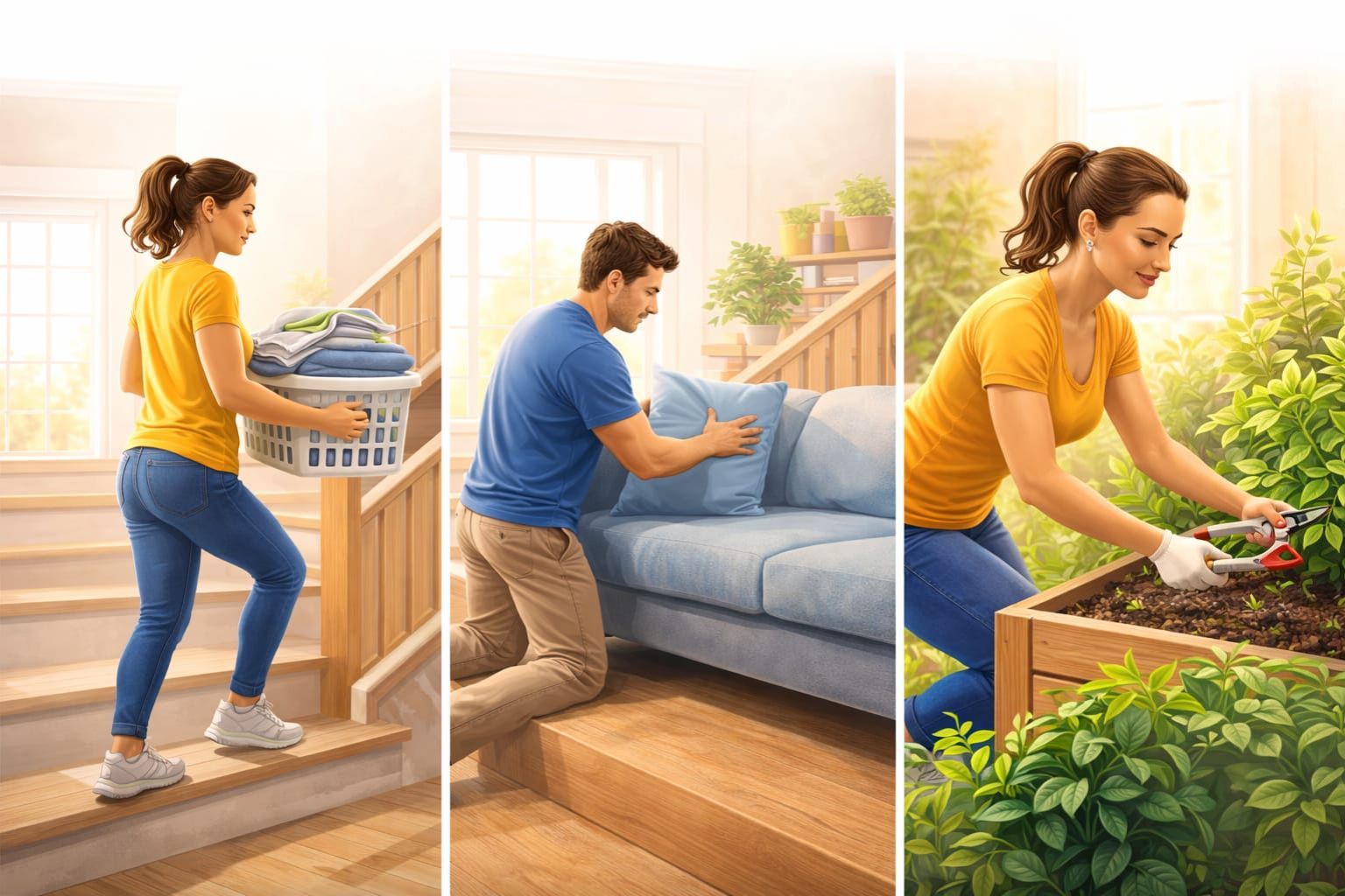 - Strength moves: Include squats, lunges, push-ups (or knee push-ups), and chair dips. These exercises train your legs, glutes, arms, and back with no equipment. Aim for 2–3 sets of 8–15 reps of each move.